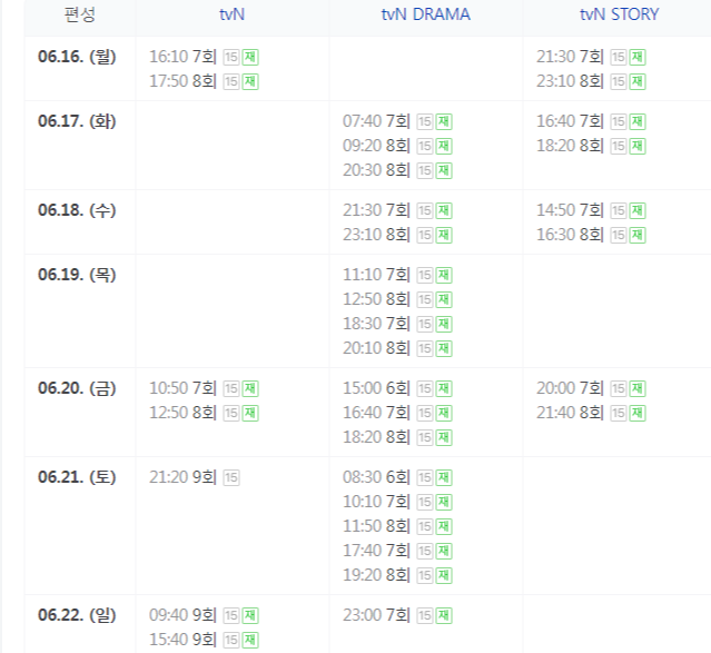 tvN 기준으로는 매주 일요일 오후 1시와 월요일 새벽 2시에 재방송이 편성되어 있으며, 편성표는 주간마다 유동적으로 변경될 수 있습니다.