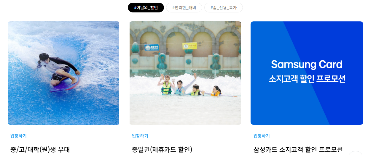 트렌드에 맞춘 스마트한 선택으로, 비용은 줄이고 즐거움은 두 배! 지금 바로 할인 혜택을 확인하고 캐리비안베이의 시원한 물세상으로 떠나보세요!